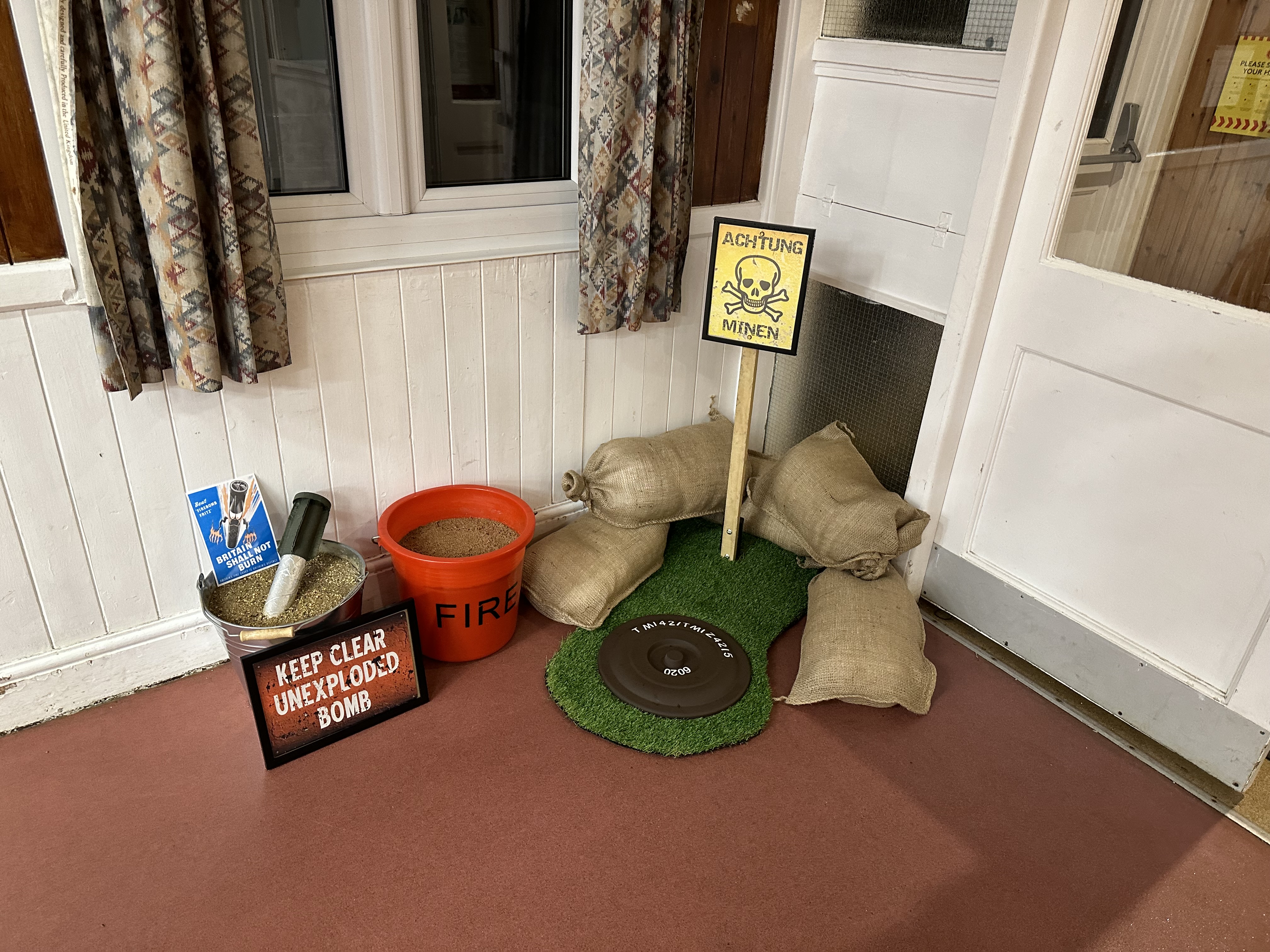 Luckily the incendiary bomb was in a bucket of sand and no-one trod on the land mine.