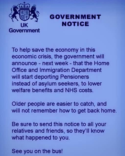 I saw the following recently and although I am fairly certain this is a spoof, I thought I would share it just in case some of us older members of society may wish to group together and hide in the woods rather along the lines of the resistance during World War Two. Unfortunately, with this government anything could be true!