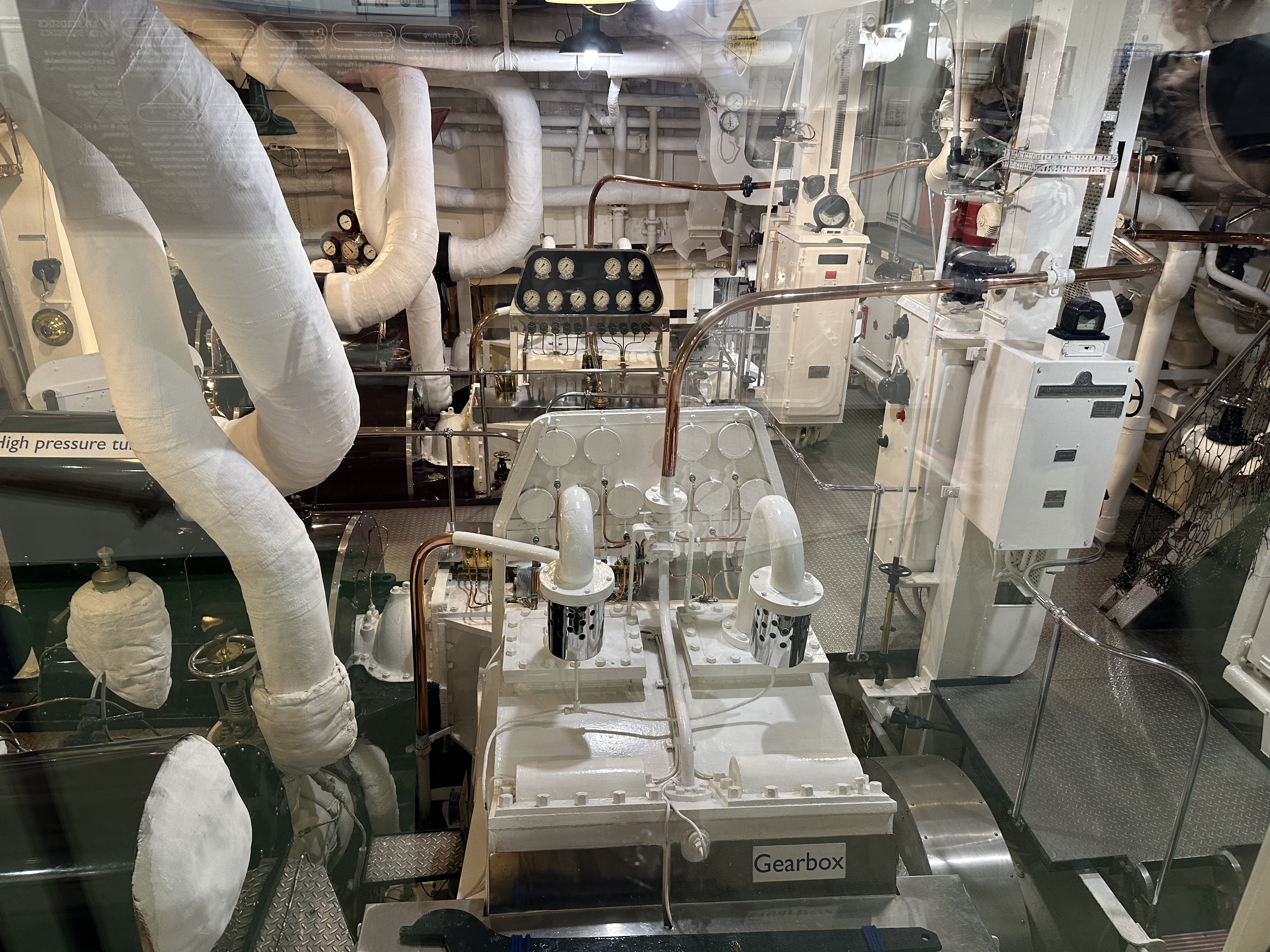The rather stunningly clean engine room, judging by this the whole ship must have been awash with asbestos which was probably the reason a refit was too expensive.